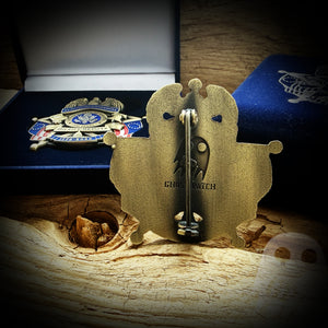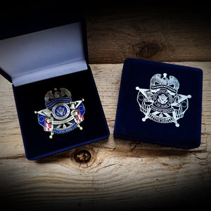 This is a solid metal 2.65" solid metal badge with pin backing. It comes in a felt keepsake box.
