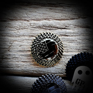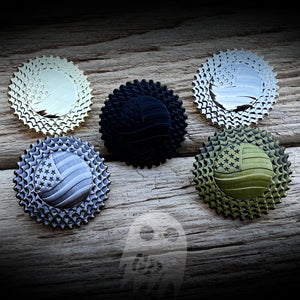 This is a 1" solid metal pin available in shiny silver, shiny gold, subdued silver, subdued gold, and black.