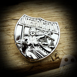 This is a 1.1" solid metal pin available in shiny silver, shiny gold, subdued silver, subdued gold, and black.