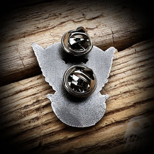 This is a 1.25" solid metal pin available in subdued silver, subdued gold, and black.