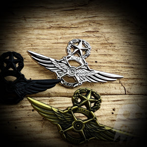 This is a 2.5" solid metal pin available in shiny silver, shiny gold, subdued silver, subdued gold, and black.