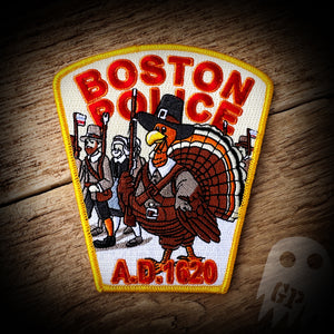 The Boston, Massachusetts Police Department 2023 Thanksgiving patch. Yes, you get both! The 1620 and 1492 misfit. Long story short, we were making these around Columbus Day and we got the 1492 Columbus sailed the ocean blue poem stuck in our head and we were stupid and no one caught it, including the POC at the department. So, now you get both. The F'd version and the correct version. For those still confused, the pilgrims landed in 1620. There go away.