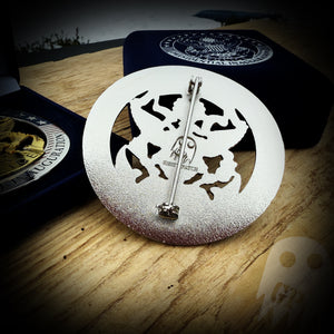 This is a solid metal 3.2" solid metal badge with pin backing. It comes in a felt keepsake box.